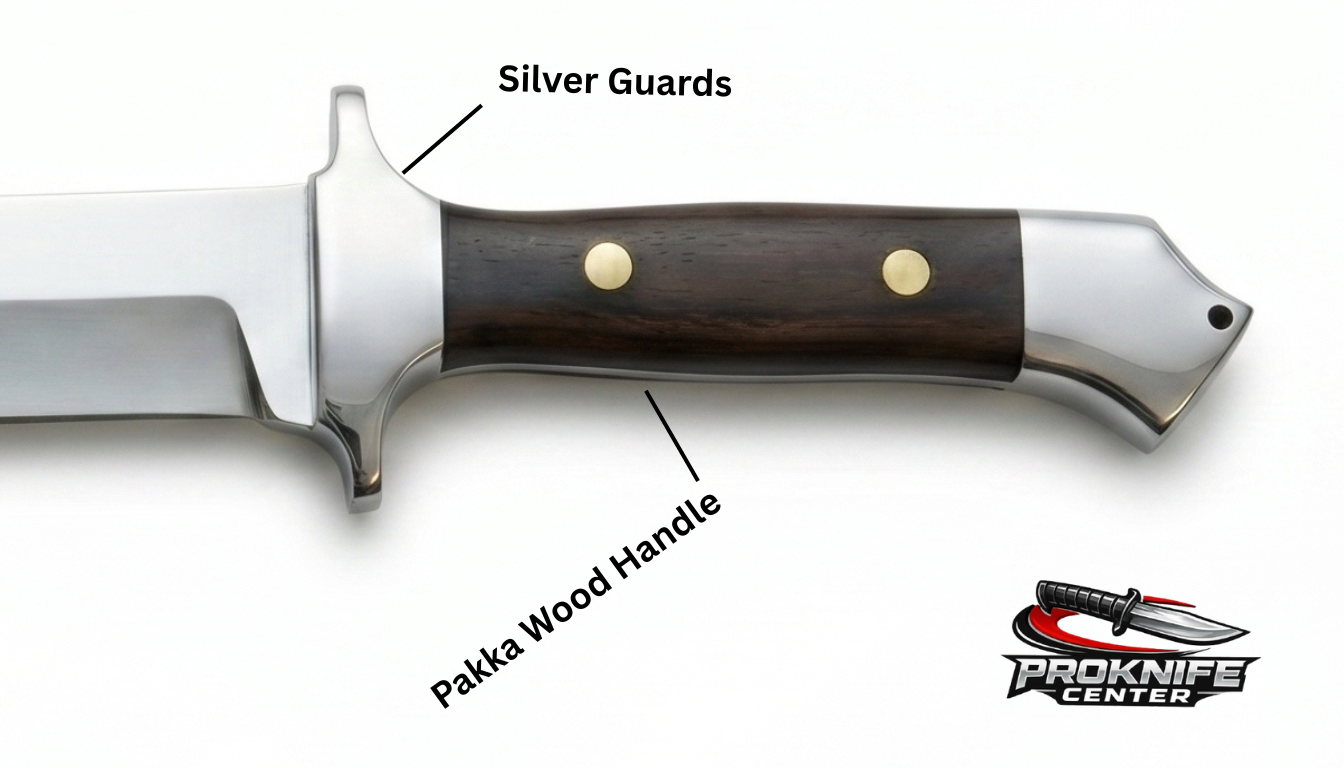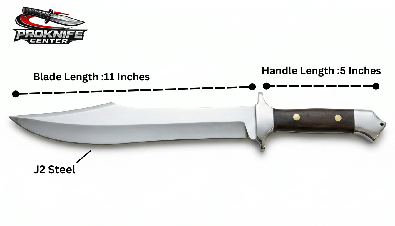This premium handcrafted Bowie knife is designed for durability, performance, and classic style. Featuring a sharp 11-inch J2 steel blade, it delivers excellent cutting power for outdoor tasks like hunting, camping, and survival use. The 5-inch ergonomic wooden handle ensures a secure and comfortable grip, enhanced with brass pins for added strength and aesthetics.